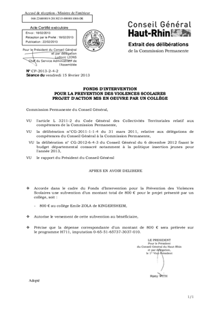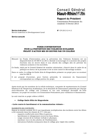 Le Fonds d'Intervention pour la prévention des Violences Scolaires est un dispositif doté de 30 000 € en 2013, destiné à encourager et à soutenir des projets d'actions mis en œuvre dans et aux abords des collèges afin de prévenir les violences scolaires et les incivilités. Ce fonds, initié par le Conseil Général de manière volontariste, s’inscrit dans le cadre de sa politique en faveur de la jeunesse et de la lutte contre le décrochage scolaire. Dans ce cadre, le collège de Emile Zola de Kingersheim présente un projet pour un montant total de 800 €. Il est proposé d'autoriser, pour l’action présentée, le versement du financement correspondant au collège porteur du projet.
