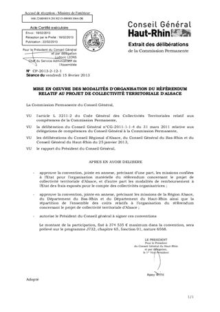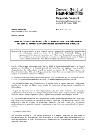 Le présent rapport a pour objet de mettre en oeuvre les modalités d'organisation du référendum relatif au projet de la Collectivité Territoriale d'Alsace en approuvant d'une part, la convention avec l'Etat pour l'organisation matérielle de la consultation, et d'autre part, la convention de financement entre la Région Alsace, le Département du Haut-Rhin et le Département du Bas-Rhin.
