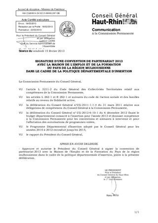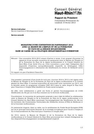 SIGNATURE D'UNE CONVENTION DE PARTENARIAT 2013 AVEC LA MAISON DE L'EMPLOI ET DE LA FORMATION DU PAYS DE LA RÉGION MULHOUSIENNE DANS LE CADRE DE LA POLITIQUE DÉPARTEMENTALE D'INSERTION