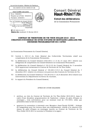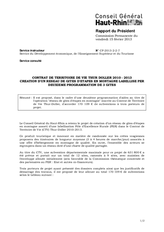 CONTRAT DE TERRITOIRE DE VIE THUR DOLLER 2010 - 2013 CREATION D'UN RESEAU DE GITES D'ETAPES EN MONTAGNE LABELLISE PER DEUXIEME PROGRAMMATION DE 3 GITES
