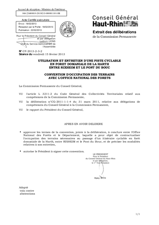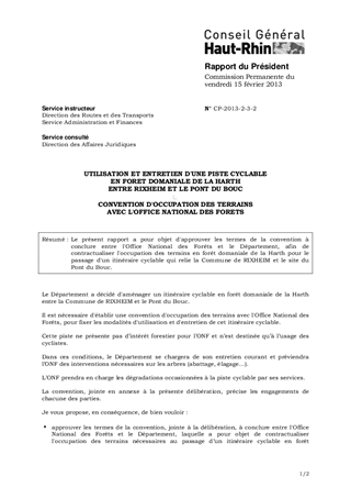 Le présent rapport a pour objet d'approuver les termes de la convention à conclure entre l'Office National des Forêts et le Département, afin de contractualiser l'occupation des terrains en forêt domaniale de la Harth pour le passage d'un itinéraire cyclable qui relie la Commune de RIXHEIM et le site du Pont du Bouc.