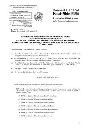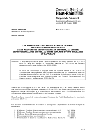 Il vous est proposé de voter l'individualisation des aides prévues au B.P 2013 dans le cadre du soutien à l'animation sportive et l’attribution de bourses départementales aux titulaires du BAFA-BAFD. Le total de l'enveloppe à engager dans ce rapport s'élève à 367 020 € en Autorisations d'Engagement pour le renouvellement de 13 conventions avec les Comités départementaux et 208 540 € en Crédits de Paiements pour l'aide aux Comités départementaux non conventionnés, au Conseil Départemental des Sports, au sport scolaire et au BAFA/BAFD.