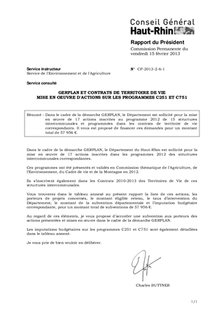 Dans le cadre de la démarche GERPLAN, le Département est sollicité pour la mise en œuvre de 17 actions inscrites au programme 2012 de 15 structures intercommunales et programmées dans les contrats de territoire de vie correspondants. Il vous est proposé de financer ces demandes pour un montant total de 57 956 €.