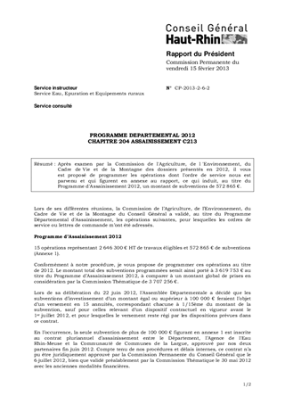 Après examen par la Commission de l'Agriculture, de l 'Environnement, du Cadre de Vie et de la Montagne des dossiers présentés en 2012, il vous est proposé de programmer les opérations dont l'ordre de service nous est parvenu et qui figurent en annexe au rapport, ce qui induit, au titre du Programme d'Assainissement 2012, un montant de subventions de 572 865 €.