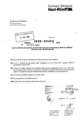 portant fixation des prix de journée hébergement et dépendance 2006 de l'EHPAD "Les Ecureuils" de MULHOUSE. Resumé Pièces jointes ARRETE Assemblée : Non défini Date : 20/02/2006 Rapporteur : Non défini Collectivité : Conseil départemental du Haut-Rhin Direction : Non défini Service : Service de la Tarification des Etablissements Domaine : Prix de Journée Commission :