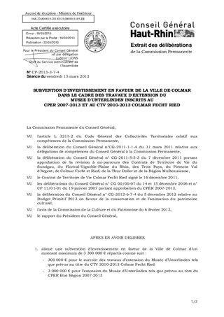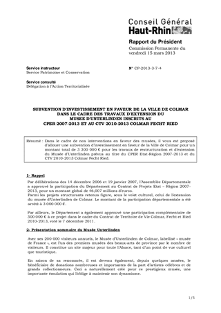 SUBVENTION D'INVESTISSEMENT EN FAVEUR DE LA VILLE DE COLMAR DANS LE CADRE DES TRAVAUX D'EXTENSION DU MUSEE D'UNTERLINDEN INSCRITS AU CPER 2007-2013 ET AU CTV 2010-2013 COLMAR FECHT RIED