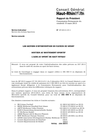 Il vous est proposé de voter l'individualisation des aides prévues au B.P 2013 dans le cadre du soutien au sport de haut niveau. Le total de l'enveloppe à engager dans ce rapport s'élève à 356 000 € en dépenses de fonctionnement.