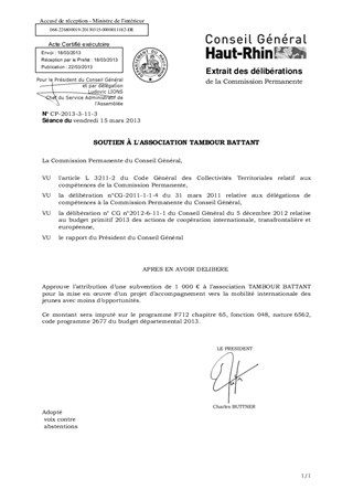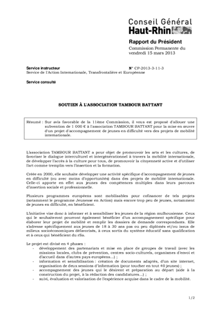 Sur avis favorable de la 11ème Commission, il vous est proposé d'allouer une subvention de 1 000 € à l'association TAMBOUR BATTANT pour la mise en œuvre d'un projet d'accompagnement de jeunes en difficulté vers des projets de mobilité internationale.