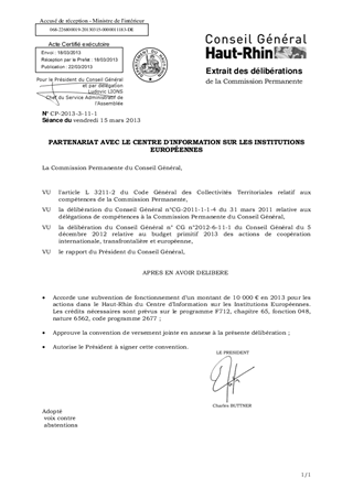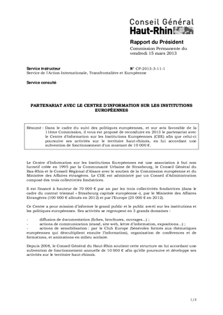 Dans le cadre du suivi des politiques européennes, et sur avis favorable de la 11ème Commission, il vous est proposé de reconduire en 2013 le partenariat avec le Centre d'Information sur les Institutions Européennes (CIIE) afin que celui-ci poursuive ses activités sur le territoire haut-rhinois, en lui accordant une subvention de fonctionnement d'un montant de 10 000 €.