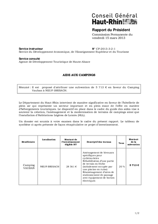 AIDE AUX CAMPINGS Resumé Il est proposé d'attribuer une subvention de 5 713 € en faveur du Camping Vauban à NEUF-BRISACH. Pièces jointes DELIBERATION RAPPORT Assemblée : Commission Permanente Date : 15/03/2013 Rapporteur : Non défini Collectivité : Conseil départemental du Haut-Rhin Direction : Non défini Service : Service Développement Economique Domaine : Tourisme Commission : Commission Permanente