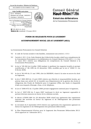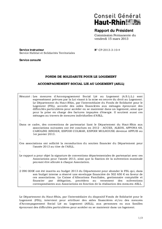 Les mesures d'Accompagnement Social Lié au Logement (A.S.L.L.) sont expressément prévues par la Loi visant à la mise en oeuvre du droit au Logement. Le Département du Haut-Rhin, par l’intermédiaire du Fonds de Solidarité pour le Logement (FSL), accorde des aides financières aux ménages éprouvant des difficultés particulières pour accéder ou se maintenir dans un logement, ainsi que pour la prise en charge des factures impayées d’énergie. Il soutient aussi ces ménages au travers de mesures individuelles d’ASLL. Dans ce cadre, des conventions de partenariat liant le Département du Haut-Rhin aux associations suivantes ont été conclues en 2012 : ACCES, ALEOS, APPONA 68, CAROLINE BINDER, ESPOIR COLMAR, ESPOIR MULHOUSE devenue APPUIS au 1er janvier 2013. Ces associations ont sollicité la reconduction du soutien financier du Département pour l’année 2013 au titre de l’ASLL. Le rapport a pour objet la signature de conventions départementales de partenariat avec ces Associations pour l’année 2013, ainsi que la fixation de la subvention maximale pouvant être allouée à chaque Association. 2 090 000€ ont été inscrits au budget 2013 du Département pour abonder le FSL qui, dans son budget interne a réservé une enveloppe financière de 502 650 € en faveur de ces associations. La Caisse d'Allocations Familiales, gestionnaire comptable et financier par délégation, procèdera au versement des subventions correspondantes aux Associations en fonction de la réalisation des mesures ASLL.