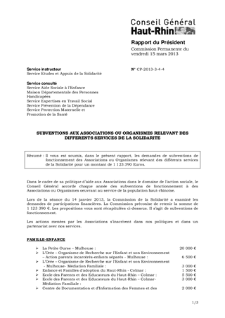 Il vous est soumis, dans le présent rapport, les demandes de subventions de fonctionnement des Associations ou Organismes relevant des différents services de la Solidarité pour un montant de 1 123 390 Euros.