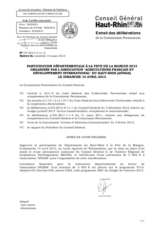 PARTICIPATION DÉPARTEMENTALE À LA FETE DE LA MANGUE 2013 ORGANISÉE PAR L'ASSOCIATION "AGRICULTEURS FRANÇAIS ET DÉVELOPPEMENT INTERNATIONAL" DU HAUT-RHIN (AFDI68) LE DIMANCHE 14 AVRIL 2013