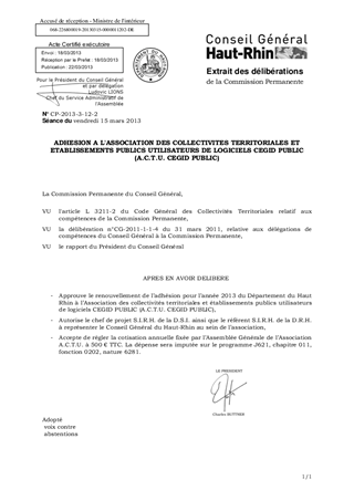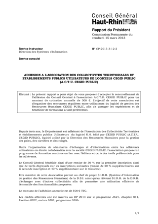 Le présent rapport a pour objet de vous proposer d’accepter le renouvellement de l’adhésion du Conseil Général à l’association A.C.T.U. CEGID PUBLIC pour un montant de cotisation annuelle de 500 €. L’objectif de cette association est d’organiser des rencontres régulières entre utilisateurs du logiciel de gestion des Ressources Humaines CEGID PUBLIC, afin de partager les expériences et de bénéficier de formations à tarif préférentiel.