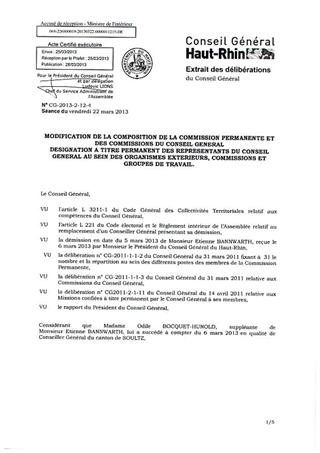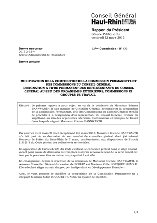 Le présent rapport a pour objet, au vu de la démission de Monsieur Etienne BANNWARTH de son mandat de Conseiller Général, de compléter la composition de la Commission Permanente, celle des Commissions du Conseil Général et enfin de procéder à la désignation d'un représentant du Conseil Général, titulaire ou suppléant, au sein des organismes extérieurs, Commissions et Groupes de Travail dans lesquels siégeait Monsieur Etienne BANNWARTH.