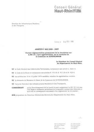 portant réglementation permanente de la circulation sur la RD 15 I, hors agglomération, sur le territoire de la commune de GUNDOSLHEIM. Resumé Pièces jointes ARRETE Assemblée : Non défini Date : 28/02/2006 Rapporteur : Non défini Collectivité : Conseil départemental du Haut-Rhin Direction : Non défini Service : Direction des Routes Domaine : Circulation Commission :