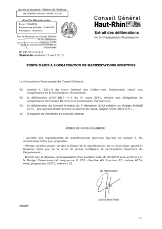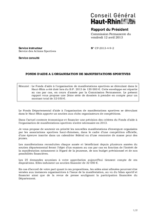 Le Fonds d'aide à l'organisation de manifestations sportives se déroulant dans le Haut-Rhin a été doté lors du B.P. 2013 de 120 000 €. Cette enveloppe est répartie au cas par cas, en cours d'année par la Commission Permanente. Le présent rapport vous propose une 2ème série de dossiers à prendre en compte pour un montant total de 32 050 €.