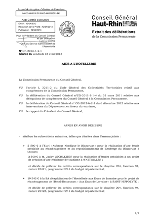 Il est proposé d'attribuer un montant global de subventions de 24 543 € en faveur de 3 établissements hôteliers, de prolonger la durée de validité de la subvention accordée à M. Jean-Michel KIEFFER (Hôtel-Restaurant des Vosges à SEWEN) lors de la Commission Permanente du 26 février 2010 et d'approuver l'avenant à la convention afférente.