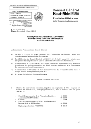 Le rapport a pour objet l'attribution de subventions à divers organismes et associations, dans le cadre de notre politique en faveur de la jeunesse, en 2013: prévention routière, information des jeunes, éducation populaire, animation transfrontalière. Le montant total des subventions proposées est égal à 288 001 €.