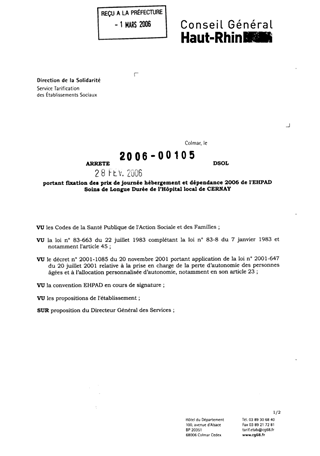 portant fixation des prix de journée hébergement et dépendance 2006 de l'EHPAD soins de longue durée de l'hôpital local de CERNAY. Resumé Pièces jointes ARRETE Assemblée : Non défini Date : 28/02/2006 Rapporteur : Non défini Collectivité : Conseil départemental du Haut-Rhin Direction : Non défini Service : Service de la Tarification des Etablissements Domaine : Prix de Journée Commission :