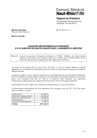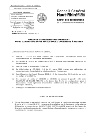 GARANTIE DÉPARTEMENTALE D'EMPRUNT O.P.H. HABITATS DE HAUTE ALSACE POUR 2 LOGEMENTS À BRETTEN