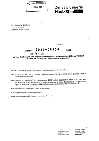 portant fixation des prix de journée hébergement et dépendance 2006 de l'EHPAD maison de retraite de l'hôpital local de CERNAY. Resumé Pièces jointes ARRETE Assemblée : Non défini Date : 28/02/2006 Rapporteur : Non défini Collectivité : Conseil départemental du Haut-Rhin Direction : Non défini Service : Service de la Tarification des Etablissements Domaine : Prix de Journée Commission :
