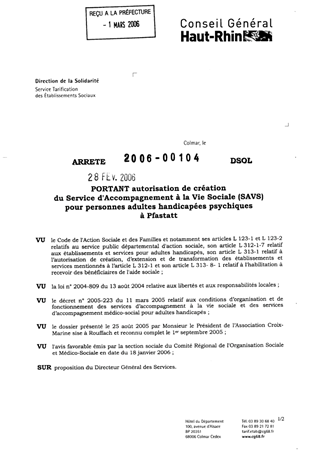 portant autorisation de création du Service d'Accompagnement à la Vie Sociale (SAVS) pour personnes adultes handicapées psychiques à PFASTATT. Resumé Pièces jointes ARRETE Assemblée : Non défini Date : 28/02/2006 Rapporteur : Non défini Collectivité : Conseil départemental du Haut-Rhin Direction : Non défini Service : Service de la Tarification des Etablissements Domaine : Autres (non classés) Commission :