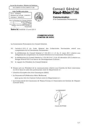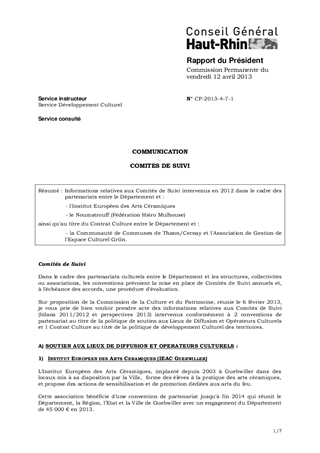 Informations relatives aux Comités de Suivi intervenus en 2012 dans le cadre des partenariats entre le Département et : - l'Institut Européen des Arts Céramiques - le Noumatrouff (Fédération Hiéro Mulhouse) ainsi qu'au titre du Contrat Culture entre le Département et : - la Communauté de Communes de Thann/Cernay et l'Association de Gestion de l'Espace Culturel Grün.