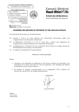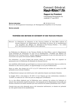 La Fédération du Bâtiment et des Travaux Publics du Haut-Rhin sollicite le soutien financier du Département du Haut-Rhin en faveur de la manifestation « Les Trophées des Métiers du Bâtiment et des Travaux Publics ». Un crédit de 2 100 € pourrait être affecté à cette opération.