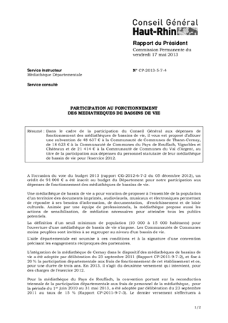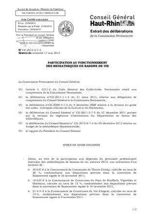 Dans le cadre de la participation du Conseil Général aux dépenses de fonctionnement des médiathèques de bassins de vie, il vous est proposé d’allouer une subvention de 48 637 € à la Communauté de Communes de Thann-Cernay, de 18 623 € à la Communauté de Communes du Pays de Rouffach, Vignobles et Châteaux et de 21 414 € à la Communauté de Communes du Val d’Argent, au titre de la participation aux dépenses du personnel statutaire de leur médiathèque de bassin de vie pour l’exercice 2012.