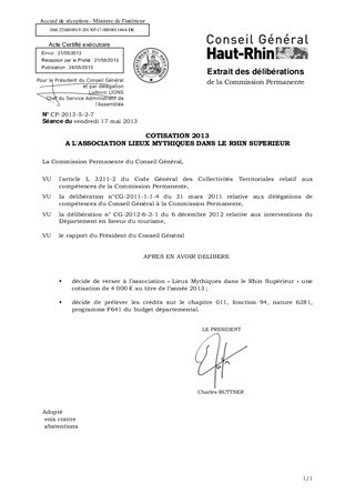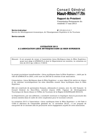 Il est proposé de verser à l'association Lieux Mythiques dans le Rhin Supérieur, ayant son siège à LÖRRACH et dont le Département est membre, la cotisation au titre de 2013 qui s'élève à 4 000 €.