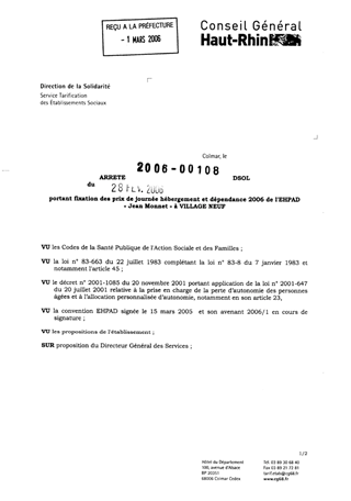 portant fixation des prix de journée hébergement et dépendance 2006 de l'EHPAD "Jean Monnet" à VILLAGE NEUF. Resumé Pièces jointes ARRETE Assemblée : Non défini Date : 28/02/2006 Rapporteur : Non défini Collectivité : Conseil départemental du Haut-Rhin Direction : Non défini Service : Service de la Tarification des Etablissements Domaine : Prix de Journée Commission :