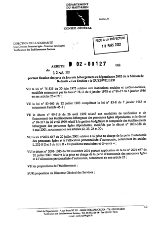 Portant fixation des prix de journée hébergement et dépendance 2002 de la maison de retraite les Erables à GUEBWILLER Resumé Pièces jointes ARRETE Assemblée : Non défini Date : 13/03/2002 Rapporteur : Non défini Collectivité : Conseil départemental du Haut-Rhin Direction : Non défini Service : Service de la Tarification des Etablissements Domaine : Prix de Journée Commission :
