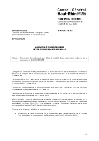 Proposition de prolongation de délai de validité d'une subvention en faveur de la commune de BALDERSHEIM.