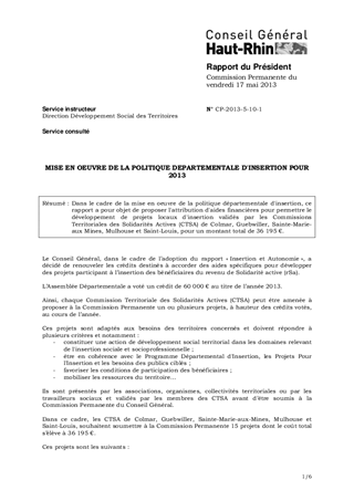 MISE EN OEUVRE DE LA POLITIQUE DEPARTEMENTALE D'INSERTION POUR 2013