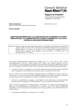 Dans le cadre des aides départementales à la réalisation de logements locatifs très sociaux privés et au titre de la résorption de l’Habitat Indigne et du programme « Habiter Mieux » en faveur de la lutte contre la précarité énergétique pour les propriétaires occupants, sont éligibles à une subvention 31 dossiers pour un montant total de 70 160 €.