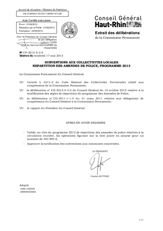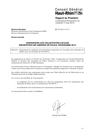 SUBVENTIONS AUX COLLECTIVITES LOCALES REPARTITION DES AMENDES DE POLICE, PROGRAMME 2013