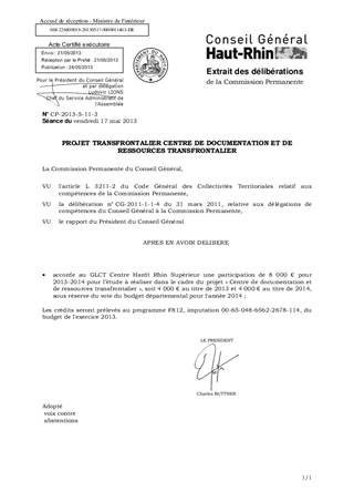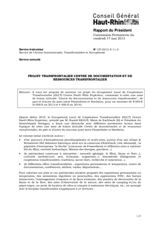 Il vous est proposé de soutenir un projet du Goupement Local de Coopération Transfrontalier (GLCT) Centre Hardt Rhin Supérieur, consistant à créer une zone de loisirs intitulée "Centre de documentation et de ressources transfrontalier", de part et d'autre du pont entre Fessenheim et Hartheim, pour un montant de 8 000 € (4 000 € en 2013 et 4 000 € en 2014).