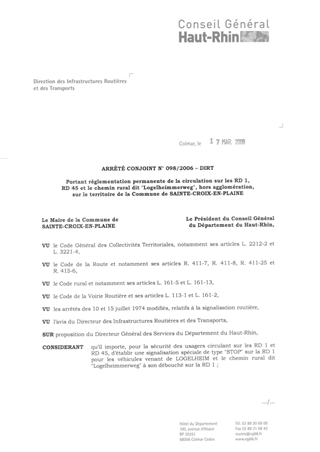 portant réglementation permanente de la circulation sur les RD 1, RD 45 et le chemin rural dit "Logelheimmerweg", hors agglomération, sur le territoire de la commune de SAINTE CROIX EN PLAINE. Resumé Pièces jointes ARRETE Assemblée : Non défini Date : 17/03/2006 Rapporteur : Non défini Collectivité : Conseil départemental du Haut-Rhin Direction : Non défini Service : Direction des Routes Domaine : Circulation Commission :