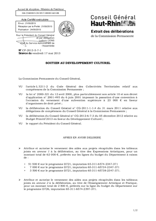 Il est proposé, dans le présent rapport : - d'attribuer des subventions à 26 associations et collectivités au titre de 3 politiques de soutien en faveur du Développement Culturel pour un montant total d’aides de 181 800 € dont : . 62 000 € au titre des Expressions Artistiques . 2 800 € au titre de l’Enseignement Artistique et Pratique . 117 000 € au titre des Lieux de Diffusion et Opérateurs Culturels - de valider et d'autoriser le Président à signer : . la convention annuelle entre le Département et l'Opéra National du Rhin pour la mise en œuvre du volet haut-rhinois de l'action culturelle de l'Opéra en 2013 ; . la convention de partenariat entre le Département, la Fédération Hiéro Colmar et la Ville de Colmar pour la mise en œuvre du projet artistique et culturel du CRMA de 2013 à 2016.