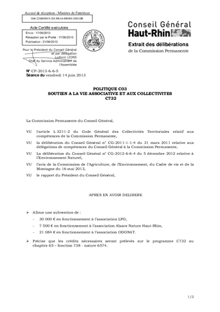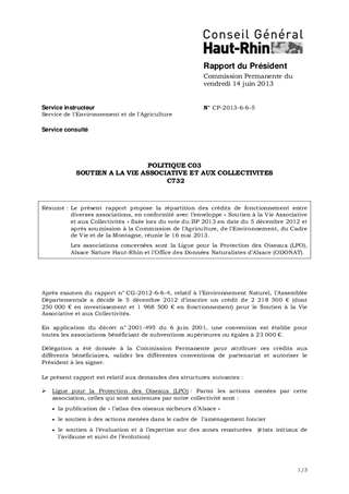 Le présent rapport propose la répartition des crédits de fonctionnement entre diverses associations, en conformité avec l’enveloppe « Soutien à la Vie Associative et aux Collectivités » fixée lors du vote du BP 2013 en date du 5 décembre 2012 et après soumission à la Commission de l'Agriculture, de l'Environnement, du Cadre de Vie et de la Montagne, réunie le 16 mai 2013. Les associations concernées sont la Ligue pour la Protection des Oiseaux (LPO), Alsace Nature Haut-Rhin et l’Office des Données Naturalistes d’Alsace (ODONAT).