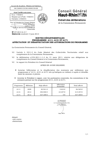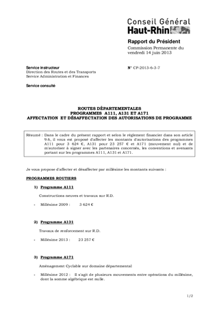 ROUTES DÉPARTEMENTALES PROGRAMMES A111, A131 ET A171 AFFECTATION ET DÉSAFFECTATION DES AUTORISATIONS DE PROGRAMME