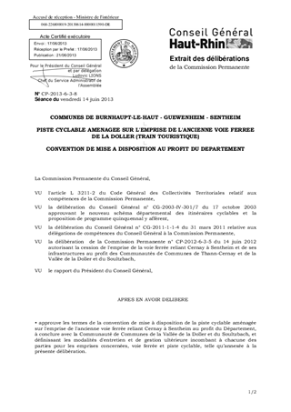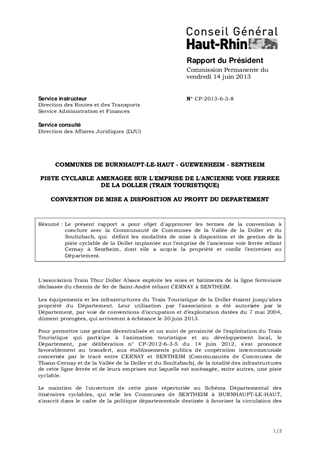 COMMUNES DE BURNHAUPT-LE-HAUT - GUEWENHEIM - SENTHEIM PISTE CYCLABLE AMENAGEE SUR L'EMPRISE DE L'ANCIENNE VOIE FERREE DE LA DOLLER (TRAIN TOURISTIQUE) CONVENTION DE MISE A DISPOSITION AU PROFIT DU DEPARTEMENT