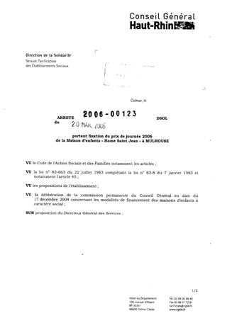 portant fixation du prix de journée 2006 de la maison d'enfants "Home Saint Jean" à MULHOUSE. Resumé Pièces jointes ARRETE Assemblée : Non défini Date : 20/03/2006 Rapporteur : Non défini Collectivité : Conseil départemental du Haut-Rhin Direction : Non défini Service : Service de la Tarification des Etablissements Domaine : Prix de Journée Commission :