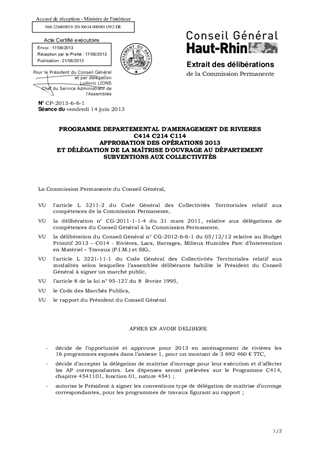 PROGRAMME DEPARTEMENTAL D'AMENAGEMENT DE RIVIERES C414 C214 C114 APPROBATION DES OPÉRATIONS 2013 ET DÉLÉGATION DE LA MAÎTRISE D'OUVRAGE AU DÉPARTEMENT SUBVENTIONS AUX COLLECTIVITÉS