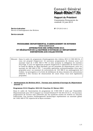 Dans le cadre du programme d’aménagement des rivières 2013 (4 500 000 €), il vous est proposé d’approuver 16 nouveaux programmes de travaux pour un montant total de 3 692 460 € TTC et d'en accepter la délégation de maîtrise d’ouvrage. Il vous est également proposé d'approuver 5 opérations de travaux sur le Canal du Rhône au Rhin Déclassé, qui est propriété du Département, pour un montant de 400 000 € TTC. 7 nouvelles opérations subventionnables vous sont proposées pour un montant de subventions de 162 880 € en aménagement de rivières. La prorogation et la levée de déchéance de deux dossiers de subventions relatives à des travaux de renaturation de cours d’eau vous sont également proposées.