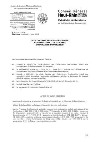 Le principe de construction d'un gymnase sur le site du collège Bel Air à Mulhouse a été inscrit au Programme Prévisionnel des Investissements 2013-2014 pour les collèges en Séance Plénière du 05 décembre 2012 pour un montant de 3,5 M€ TTC. L’objet de ce rapport est l’approbation du programme de construction d’un gymnase sur le site du collège Bel Air à MULHOUSE. Le montant prévisionnel de cette opération est estimé à 2 929 000 €/HT (arrondi à 3 500 000 €/TTC) – valeur fin d’opération septembre 2016.