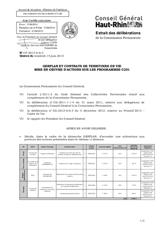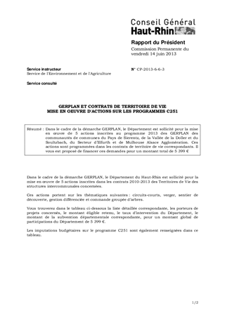 Dans le cadre de la démarche GERPLAN, le Département est sollicité pour la mise en œuvre de 5 actions inscrites au programme 2013 des GERPLAN des communautés de communes du Pays de Sierentz, de la Vallée de la Doller et du Soultzbach, du Secteur d’Illfurth et de Mulhouse Alsace Agglomération. Ces actions sont programmées dans les contrats de territoire de vie correspondants. Il vous est proposé de financer ces demandes pour un montant total de 5 399 €