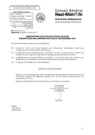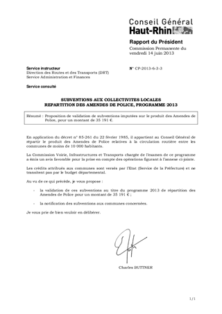 SUBVENTIONS AUX COLLECTIVITES LOCALES REPARTITION DES AMENDES DE POLICE, PROGRAMME 2013