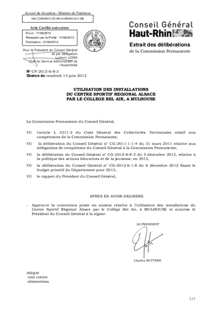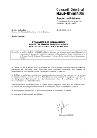 Le collège Bel Air, à MULHOUSE, ne dispose pas d'équipement sportif intégré ou communal de proximité. L'objet du rapport est la passation d'une convention avec le Centre Sportif Régional Alsace, dans l'attente de la construction d'un gymnase intégré.